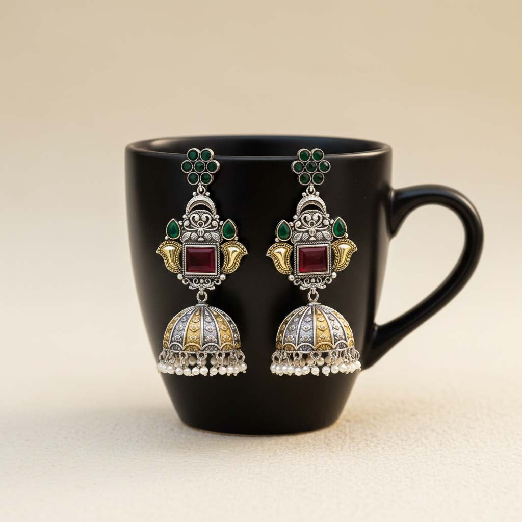 Gold & Silver Color Oxidised Earrings Showing Luxurious Dual-Tone Artistry Ideal For Celebrations