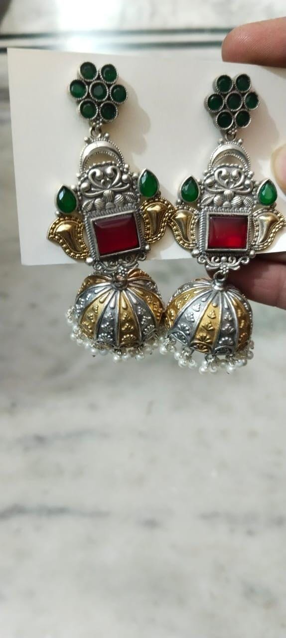 Maroon & Green Color Oxidised Earrings Blending Dual-Tone Shades For Rich Traditional Elegance